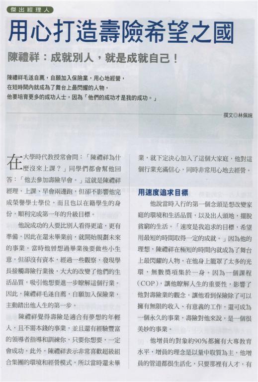 陈礼祥毛遂自荐,自愿加入保险业,用心地经营,在短时间内就成为了舞台上最闪耀的人物,他要培养更多的成功人士,因为(他们的成功才是我的成功)